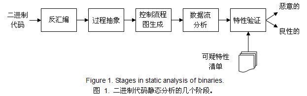 图1给出静态分析二进制代码检查恶意行为的图示。出于我们的讨论目的,我们假设输入的二进制代码没有加密。由于有此约束,图中的分析不能用于多态病毒。即使没有多态也有足够多的东西要我们担心了,因此我们忽略这方面。