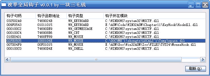 下图是程序运行后显示的所有的全局钩子,包括钩子函数在那个动态库中,也就是创建钩子的动态库。图中显示的钩子句柄是指得在当前进程中的句柄,不是系统范围的。比如说 MouseHook 添加了一个全局的鼠标钩子,那么在 explorer 中这个钩子的句柄和在 word 中的句柄是不同的(这一点我是通过 Icesword 观察到的),但都是 MouseHook 添加的钩子都在 mousehook.dll 动态库中。如果想获得 Icesword 一样的结果可以针对每一个进程枚举全局钩子(没试过)。l另外,如果鼠标钩子和键盘钩子不能够显示动态库,可以先动一动鼠标,摁几下键盘再刷新应该就可以显示。