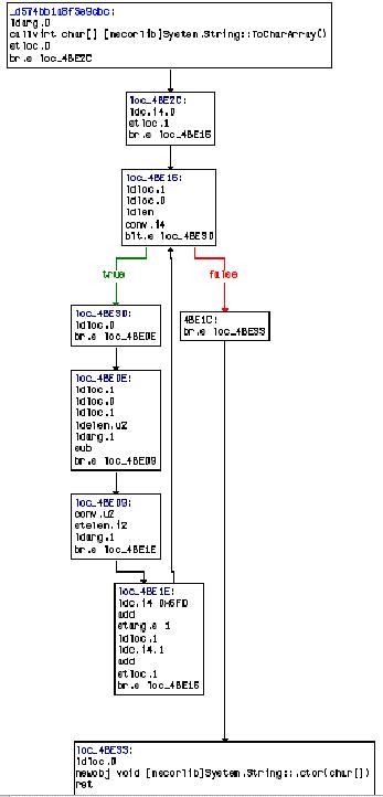 .NET Reflector之所以不能反编译,是因为XenoCode把中间语言拆成若干段,每段用br或者br.s(相当于jmp)衔接起来。至于为什么.NET Reflector不会解释成goto,我也不太清楚,估计是因为与一条完整的C#语句等价的IL程序段被拆开两半。(哪位大侠知道请指教一下)。反混淆的方法也非常直接,把代码段重新排序就可以了,反混淆的结果如图