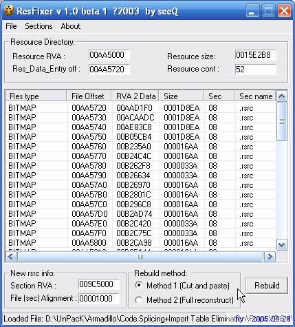 ResFixer的两种修复方法要注意一下。如果壳挪动了资源项,则需要选择Method 2(Full Reconstruct)来Rebuild。如果只是调整Resource RVA,选择Method 1(Cut And Paste)即可。另外ResFixer有bug,修复某些程序资源时会异常出错。
