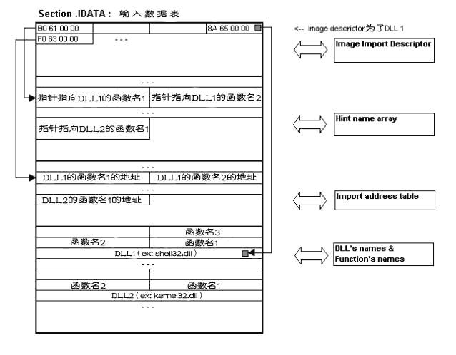 通常,输入地址表本该包含被调用函数的地址,现在用来指向每个DLL函数名.