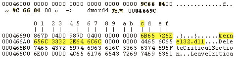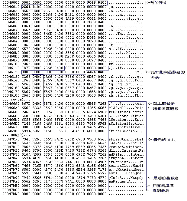 最后的指针指向函数的结尾(DLL函数名的结尾)是由双词00表示 (0000 0000)