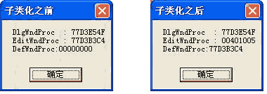 测试说明 :左图==》DlgWndProc和EditWndProc实际上就是系统默认的对话框处理函数体和