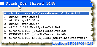 通过上面的图可以看出有三线程,因为原程序最少要一主线程,因此可以推测外壳创建了一或两个线程,我自己用VB写的程序,其中并没有用到多线程,因此可以判断其中有两个线程是外壳创建的,那么哪两个线程是外壳创建的呢,再试双击可以发现:
