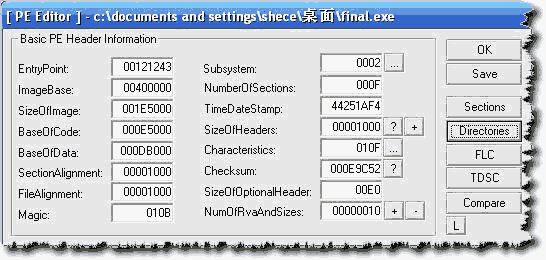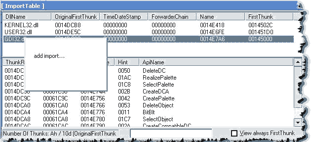 OK! 上面已经给出了主要代码了,至于资源方面的设计相信大家都会,这里就不在多说。(具体见源代码)接下来,我们需要讲的是,如何使用我们这个dll,刚才不是说了吗?需要将我们刚才输出的DummyFunc添加到我们需要修改的程序的输入表中,手动添加当然可以(这要求对PE文件的结构有足够的了解),不过现在教大家用工具快速添加,打开LordPE,加载我们需要修改的exe文件,如图一: