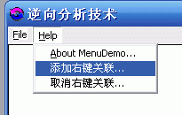 已知“ABOUT MENUDEMO”的菜单ID为40019(9C53H),再设置“添加右键关联”为40020(9C54H),“取消右键关联”40021(9C55H)。