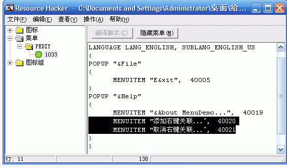 我们先用Resource Hacker为程序添加两个子菜单: