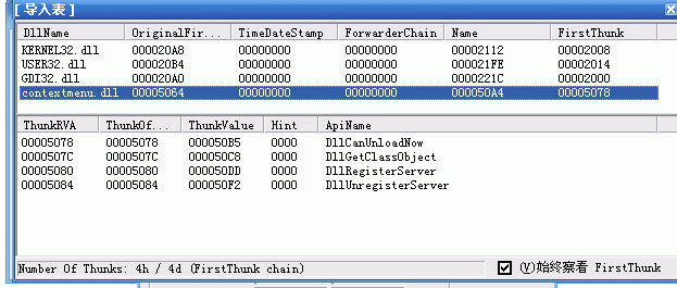 DllRegisterServer为00005080,DllUnregisterServer为005084,那调用时就可以用基地址+THUNKRVA值的方法(记住勾选始终查看FIRSTTHUNK值)。