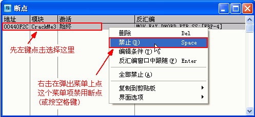 大家注意看一下,地址 00440F51 处的 CALL CrackMe3.00403B2C 和上面我们分析的地址 00440F34 处的 CALL CrackMe3.00403B2C 是不是汇编指令都一样啊?这说明检测用户名和注册码是用的同一个子程序。而这个子程序 CALL 我们在上面已经分析过了。我们执行到现在可以很容易得出结论,这个 CALL 也就是把我们输入的注册码与 00440F4C 地址处指令后的“GFX-754-IER-954”作比较,相等则 OK。好了,我们已经得到足够的信息了。现在我们在菜单 查看->断点 上点击一下,打开断点窗口(也可以通过组合键 ALT+B 或点击工具栏上那个“B”图标打开断点窗口):