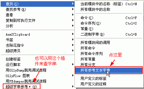 我们在反汇编窗口中右击,出来一个菜单,我们在 查找->所有参考文本字串 上左键点击: