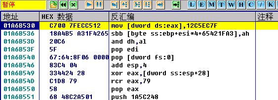 按F9,让程序运行,立即中断在aspr的第一个异常处(注意:异常次数同一程序每次载入也可能不一样,我这个会在32~~36次之间变化的,我不敢说你的娈与不变):
