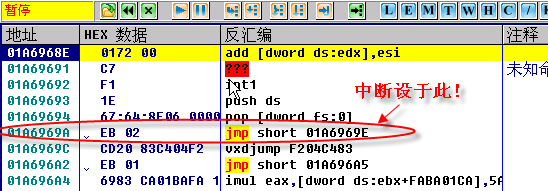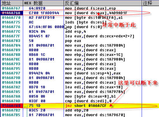 按上面设好中断,按shift+f9通过异常,中断后取消断点,向下找: