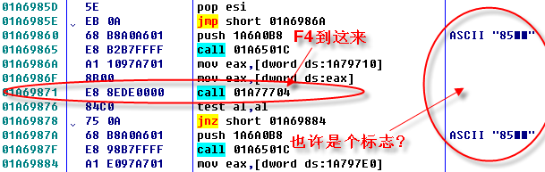 而下面这个Call出来之后,eax里就是API的地址,在整个这个段落里,我们没有必要进入到Call里边去,F8过就行了。Call