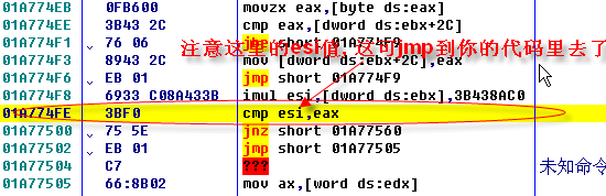 现在找syscom大侠指明的第二个特征码,找到后按syscom大侠那样jmp好了:先分一块内存,然后跳过去!又贴上你的代码,新建EIP,run!,中断后就可以收工了!当然要先看看调用壳的代码了: