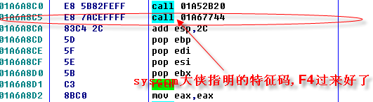 断下后取消断点,向下就可以找到syscom大侠指明的特征码了: