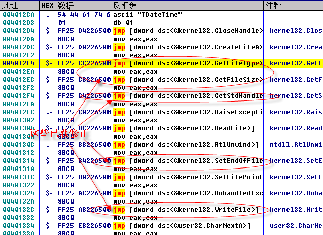 代码简单,自己看着写好了。大至就是解密出API后,到我们的IAT中找下这个API的位置,然后写入原程序就好了。看看修改后的情况:
