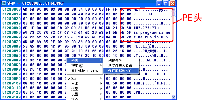 双击,查看这段内存的数据,看到了什么?PE文件头!难道这就是解密后的原文件?不妨dump下来看看。点右键,选“保存数据到文件”,然后把扩展名从mem改为exe。呵呵,图标一下又变成fox了。