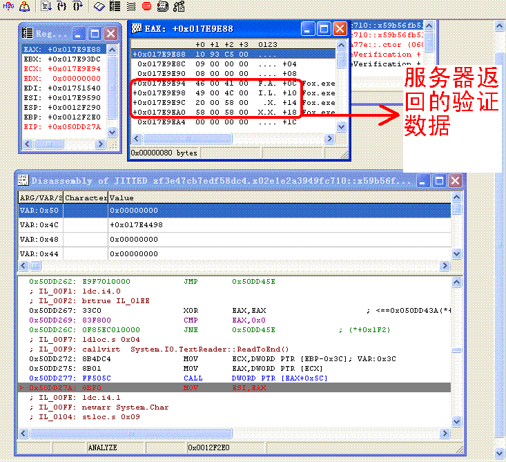 这句是建立一个读写流,读取网络验证的返回值,保存在eax中。我们双击eax,就会看到服务器返回的验证值。这里返回的是“FAIL”,失败。还有的值包括“BAD”,“EXP”过期等。这样结合静态分析,看代码是非常方便的。