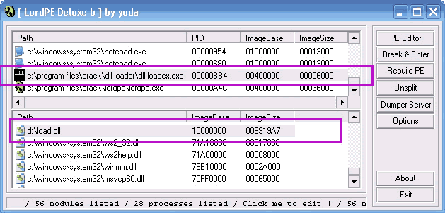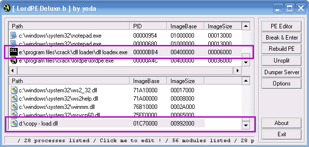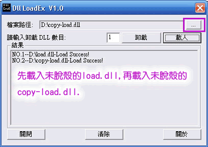 然後開啟 LordPE 在上面的窗口點選Dll LoadEx的圖示在看到下面窗口 看剛剛載入的兩個load.dll與copy-load.dll