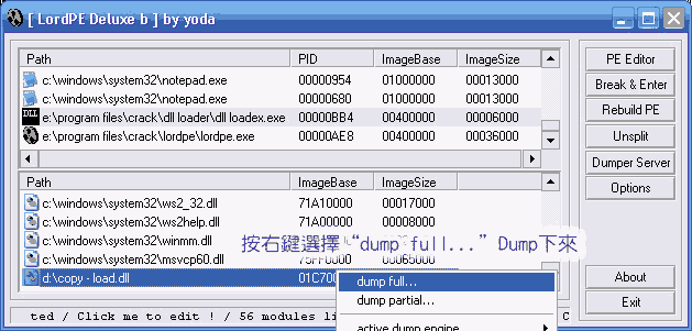 然後在 LordPE 上面將 load.dll 選擇 dump full 為 01.dll 將 copy-load.dll dump 為02.dll