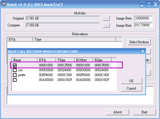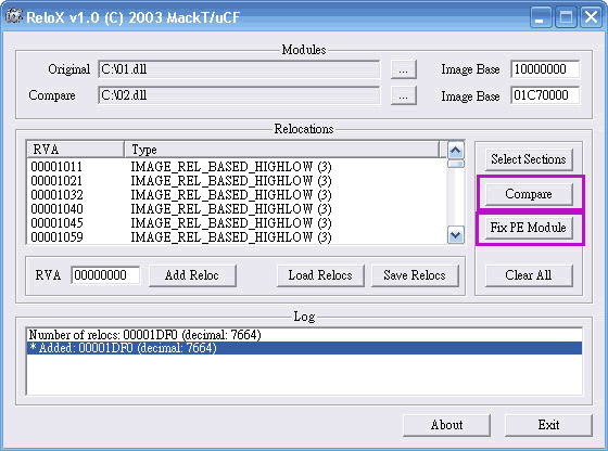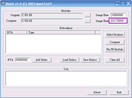 接著開啟 ReloX 將剛剛Dump的01.dll與02.dll分別載入 再右邊的框框填入剛剛在 LordPE 上看到的ImageBase