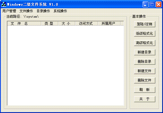 (2) 本系统主要包括两部分:文件系统低层本身逻辑存储结构的设计,文件系统基于Windows平台存储管理外壳的设计。需注意的是,目标不是软件本身而是静态的磁盘空间(以一定的规则储存数据),Windows界面的管理外壳只是提供一个可视化的平台,从而方便用户管理。