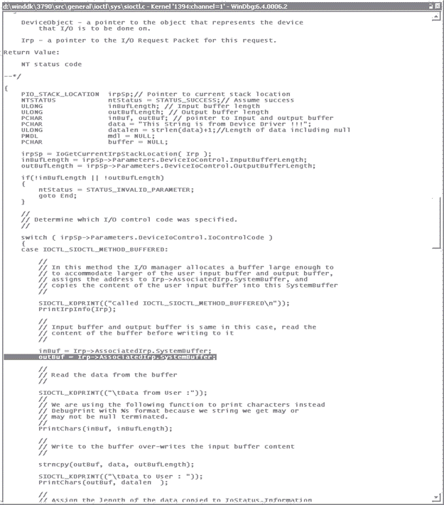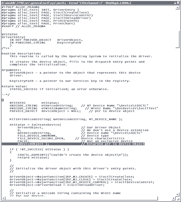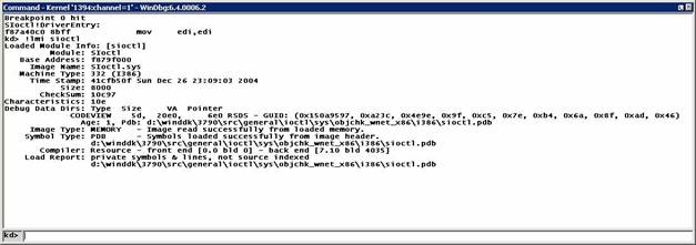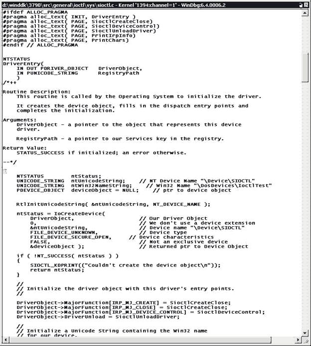 使用示例驱动IoCtl练习,这将会帮助你熟悉WinDbg。你能在WINDDK和它的后续产品,WDK中找到。安装它,你便能在src\general\Ioctl子目录下找到该驱动。IoCtl的优点在于它是示例,而且是一个¡°legacy?/span>驱动,由服务管理器(SCM)加载,而不是即插即用的一部分(这里并不关心PnP的输入和输出)。你应该建立用户态程序(ioctlapp.exe),并在前者被加载之后建立内核态驱动程序(sioctl.sys)。