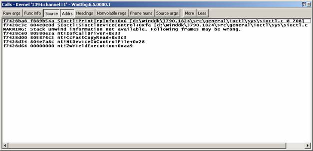 立即查看上面k 给出的参数,这需要大量的侦察工作,包括搜索堆栈和通过代码查看堆栈是如何被建立到那些位置的。这里的工作将使一种情况改变成另一种情况。这里的教训是,如果WinDbg的堆栈反向跟踪看起来很短,查看运行失败的线程被分配到的内核堆栈。如果没有,把它发掘出来。