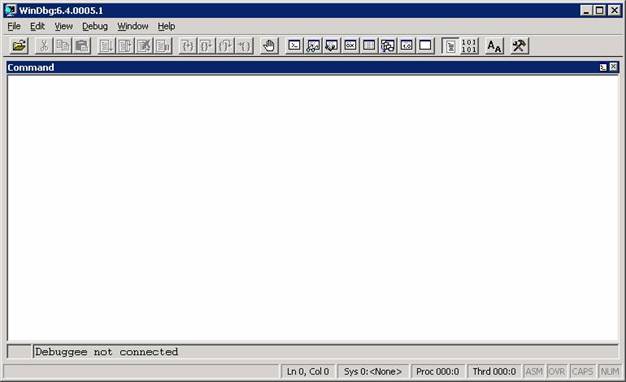 从命令提示窗口中,改变当前的目录到WINDOWS调试工具的安装目录。这是windbg.exe 和kd.exe 所在的位置。输入windbg,按下Enter。你将会看到: