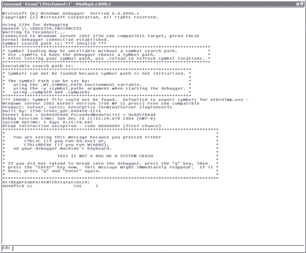 现在不必担心关于symbols的信息。你已经将WinDbg连接到WIN 2003。你现在很忙!