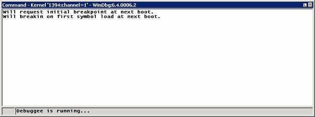 现在你已经准备好在主机和目标之间建立连接。在目标机器以其中一个调试入口启动WINDOWS。立即回到主机系统,用鼠标激活WinDbg 的命令窗口,按下CTRL+BREAK 。不久之后,你会看到: