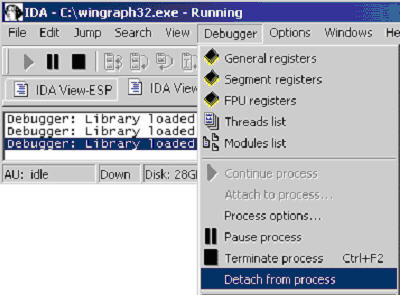 IDA支持Windows 上的DLLs和Linux上的共享库的调试, 请注意IDA也可以附加到正在本地或远程运行的Windows服务。尤其是如果你先前附加到一个Windows服务,'Detach from process'(“从进程附加”)命令将会十分有用: 它会允许您停止调试而不需要终止调试服务器上的关键Windows服务!