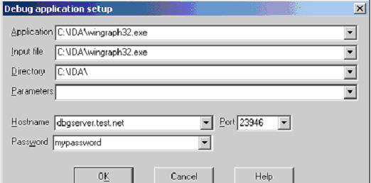 指定应用程序、目录和输入路径。注意这些文件路径在远程调试服务器上应有效,也不要忘记输入调试服务器的主机名称或IP地址:只有在这些设置被指定后,远程调试方可被激活! 最后,我们输入为远程IDA调试服务器选择的密码。