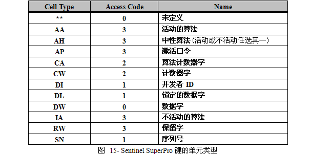 Sentinel SuperPro键的内部级单元内容 (a序列号是16位的,并且不保证它是唯一的) 程序可以使用从08单元到 每个单元有一个访问码,用它控制该单元能够被你的应用程序如何使用--它定义单元的单元类型属性。例如,一些单元类型的访问码允许单元数值被读出和被重写,而另一些单元是只读的或根本不可写入。访问码是数字0到数字3,见图14。 访问码 描述 0 可读/写的数据字 你的应用程序可以读该单元的这个字,而且,如果给出写口令,可以修改它的内容。 1 只读(锁定)数据字 你的应用程序可以读该单元的这个字,但是如果没有重写口令,则不能改变它。 2 计数器字 该单元包含一个字(数值),你的应用程序可以用写口令减量它。如果没有重写口令,则不能(用减量之外的方法)改变该单元的值。 3 锁定并隐藏的字/算法字 你的应用程序不能读该单元的数值。修改它需要重写口令。该单元数值(内容)是隐藏的(不可读)。 图 14 – Sentinel SuperPro键的单元访问码 每个单元被赋予一个代码,定义你想要如何使用此所选单元。这个代码叫做一个单元类型。单元类型划分储存在单元中的数据类型,继而影响该单元能被如何使用。每个单元类型用两个字母的缩写来识别;例如,CW标识一个计数器字。某些单元类型被设计成按组使用。例如,算法能与计数器和口令产生关联。其他单元类型有地址限制,意即只有键上特定单元才能指定为这种类型,见图15。 图16中列出Sentinel SDK的主要API函数。 函数 描述 sproActivate() 激活一个不活动的算法,以便它能被sproQuery()函数使用。 sproDecrement() 减量一个计数器字或者读/写数据字。如果计数器关联到一个活动的算法,那么计数器减到零则使该算法不活动。 sproEnumServer() 依照指定的开发者ID,列举在网络上运行的服务器个数。 sproExtendedRead() 读键的任何非隐藏的存储器单元的数值和访问码。 sproFindFirstUnit() 搜索隶属于一个指定的开发者ID的所有键。 sproFindNextUnit() 搜索隶属于同一个开发者ID的下一个键。 sproFormatPacket() 验证数据包(RNBO_SPRO_APIPACKET)的大小并初始化字段为默认值。在任何其他API函数被调用之前,这个函数必须先被调用一次。 sproGetContactServer() 返回为一个指明的API数据包设定的联系服务器。 sproGetFullStatus() 返回扩充的状态信息。它只用于支持目的。 sproGetHardLimit() 检索硬体键所支持的最大许可证数目(硬限制)。 sproGetKeyInfo() 从一个指明的服务器获得关于键的信息。 sproGetSubLicense() 取得一个指明的单元中的从属许可证。 sproGetVersion() 返回Sentinel