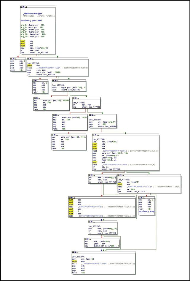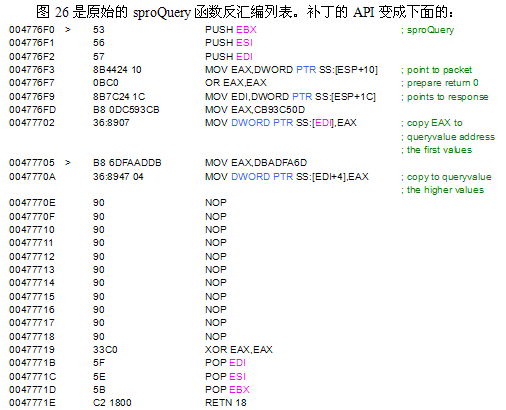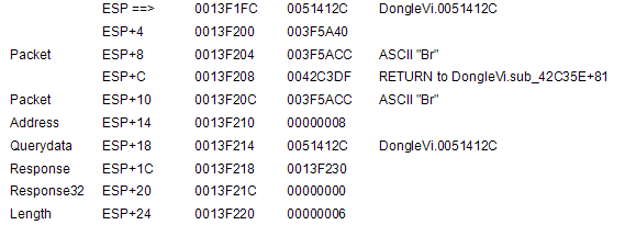 short int length ); 其中: n Packet:指向RB_SPRO_APIPACKET记录的一个指针。 n Address:要查询的字的地址。 n QueryData:指向查询字节串第一个字节的指针。 n Response:指向回应字节串第一个字节的指针。 n Response32: 指向某位置的指针,那里将会包含查询回应最后四个字节的一个拷贝。 n Length: 这是发送到活动算法的查询字节串的字节数,也是回应缓冲区的长度。 如果成功,该函数返回SP_SUCCESS(0)。 与图24的逻辑是相同的,但实现不同。 当程序在0x 但是,当你停在0x 此时寄存器EDI是指向querydata(0x 图 26 -