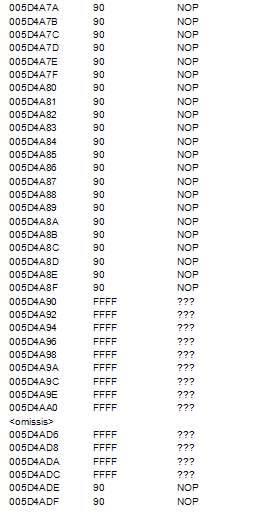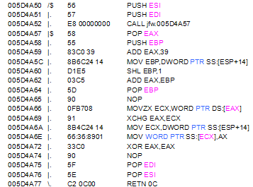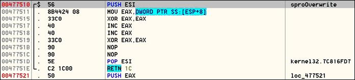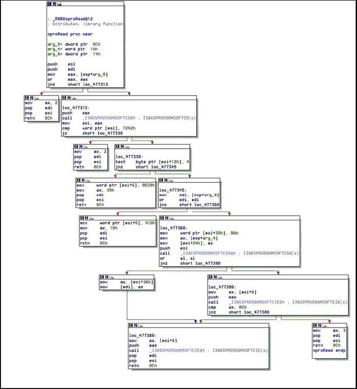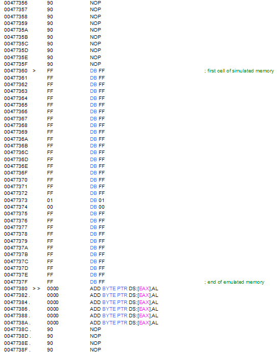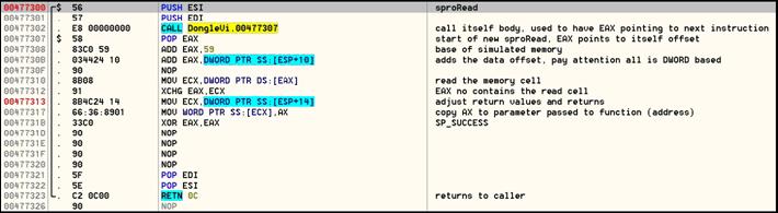 补丁的sproRead图解 该函数在下面列出。它与Crackz、GoatAss等人已经提出的那些方法很相似,但是由于未对准模拟存储器部分,他们的解决方案有的不工作、有的出错、有的不完全(至少从我的经验看):他们没有正确地考虑每个单一单元的大小。如果你需要更多的模拟存储器,在地址0x00477308处减少被增加到EAX的偏移量,如你所见,有许多空间仍然可用。 图 25 -