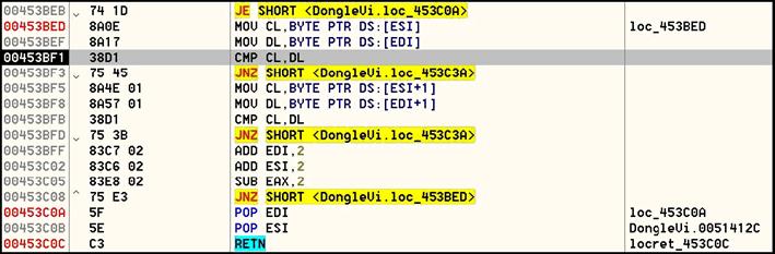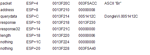DongleViewer进入sproQuery在断点之后停下 该缓冲区,已被sproQuery前面的调用填充,现在它的地址储存在EDI,而且与储存在ESI的地址0x00514132处的内容逐字节比较。如果有什么不对劲,程序就跳出。修正它的另一个可选办法是将JNZ换成JZ,但是记得我们说过,我们只专注于静态链接到应用程序的API函数库那些部份,而不改变只为某个应用程序所特有的代码。 3. 如果你再按一次F9,你将会发现缓冲区已经被删除。 这次我们是运气好