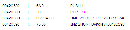 补丁的sproRead函数的载入部份 现在我们已经做好一个sproRead模拟器了,然后你还需要用正确数值填充本地内存单元。这最后一步完全取决于目标,而且必须通过检查程序对返回值做什么处理才能到达成功的彼岸。你必须跟踪程序、看它对返回的数据做什么处理(了解正确数值是什么),这是最令人厌烦的事情之一。 1. 用FF值填充所有内存单元,容易做 2. 在补丁的sproRead开始时放置一个断点BP,并跟踪程序直到它到达相应的内存单元 3. 在该单元写入数据值(该数值在[ESP+10]):例如,如果被存取的单元是 4. 使用HW硬件断点,跟踪被写的内存进入调用者,直到你弄清该程序对那个数值做什么处理。通常你会见到CMP之类。 5. 把你发现的真正数值写回该内存单元,取代那个虚设值。记得要使用LSB逻辑去写WORD值。 上面代码已经包含我从DongleViewer发现的东西。如你所见,有的单元仍然保留为FF值,因此并非所有的单元被程序使用。 例如,程序DongleViewer使用这些数据值调用sproRead:10h、11h、12h、17h、13h、14h