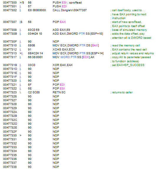 SuperPro键中任何字的数值和访问码。对我们来说,只要修正程序使之返回SP_SUCCESS给程序检查。 图22显示一些显然无用的指令;他们实际上是无用的,仅仅为调试目的。 图 22 -