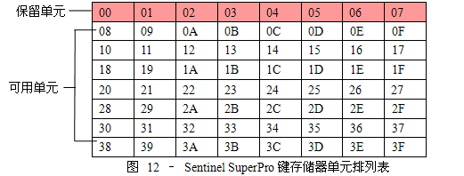 SuperPro键包含128字节存储器,按每个单元16位组成64个单元(字)。单元按十六进制从位置0到 当你规划一个单元的时候,你赋予它各种不同的属性。这些属性决定该单元(和它所含的字)该由你的应用程序如何使用。单元属性包括单元类型、访问码和单元数值。 通常,每个单元包含下列字类型之一: n 数据字:一个数据字能储存数据,如从属许可证、客户信息、序列号、口令和校验数位。你编码你的应用程序读某个字,然后鉴定所储存的数值并做相应行为。一个数据字单元可能被规划成只读或者可读/写。 n 计数器字:一个计数器字包含你设定的一个初值然后由你的应用程序减量。计数器字的一种典型使用是限制一个应用程序的示范品可运行次数。 n 算法:一个算法包含一个位模式,规定硬体键应该如何加密你的应用程序所发送的查询数据。该键使用一个算法--并且是个内部储存的专有算法--转换查询数据然后返回一个值给你的应用程序。你设计让应用程序发送查询给该键,然后鉴定返回值并且做出相应行为。 算法是活动的或不活动的。只有活动的算法能给一个查询返回有效的回应。算法是否活动由该单元值中活动的/不活动的位来控制。 每个键的00单元到07单元是内部级单元,它们包含着固定的、预编程的系统信息,见图13。 单元 内容 可读否? 00 键序列号;每个键按顺序分配。a 是 01 开发者ID;唯一对应你的公司/产品。 是 02–07 彩虹技术保留使用。 否 图 13 -