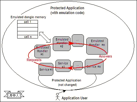 编写这些软件狗的仿真器,即是仿真这些加解密算法。因此唯一有效的方法是对算法及有关数据包进行逆向工程,或者从应用程序中剥离加密/解密算法。 模拟一个软件狗意味着需要在被保护应用程序中加入一些代码,它们模拟软件狗对应用程序请求做出的回应,如此使得应用程序不需要任何外部模块:软件狗、驱动器、仿真器。补丁的应用程序又将是一个正常的应用程序。为此,我们将需要修正那些在应用程序内实现保护设计的代码片(见图1)。 在图3我概略描述这个方法。 图 3 - 在应用程序之内模拟软件狗 图3清楚地显示我们需要在补丁的应用程序内安排一个模拟的软件狗存储器,并且用一些例行程序模拟原始的服务处理程序:很大不同在于原始回应读自模拟的存储器而非读自软件狗。应用程序中不与软件狗交互的部份保持原状。 我在本教程主要集中讨论后一种方式。 我使用一个商业应用程序(任何来自FreedomScientific[4]的应用程序也都可以)的一部份作为例子,它是用Sentinel