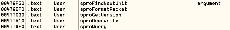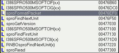 Superpro API函数 在SDK官方报告中它的API名称带前缀“RNBO”,但是我们通常提及这些API名称时不带这个前缀。从破解角度看最重要的是:sproFormatPacket、sproInitialize、sproFindFirstUnit、sproRead、sproQuery、sproOverwrite。 以下是一个典型的调用顺序,你经常能在程序中见到: 1. sproFormatPacket() –