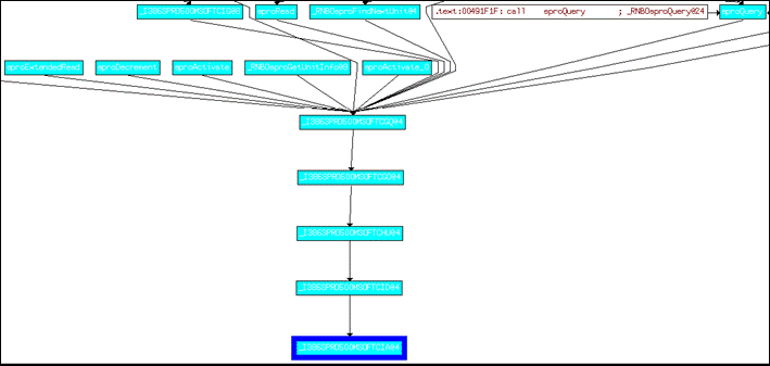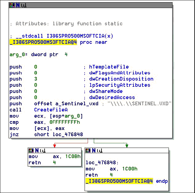 钮生成对I386SPRO500MSOFTCIA(x)函数的引用图。生成一个相当大的图,但我只要你注意图表的底部:IDA把来自特征文件的函数用彩色标明(浅蓝色),那么由于我们只应用了Sentinel特征文件,所以这些是Sentinel软件狗的库函数,被程序使用或仅仅链接它(记得静态链接一个*.lib文件可能链接它所有的函数,这取决于链接程序选项)。