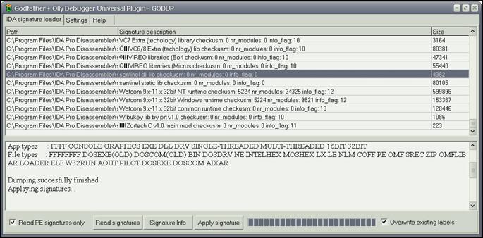 图 6 I386SPRO500MSOFTCIA(x)的图解 现在只要按 你也必须确知一件事:如果IDA报告某个函数不被引用,这不一定表示它在运行时间不会被调用,因为可能有动态消息、改变的代码以及IDA解析引擎出错。总之,我们需要对这个结果进行判断,或者说它是我们开始探究的出发点。 图7显示这个图表的底部:注意,I386SPRO500MSOFTCIA被其他内部函数调用,然后有导入库函数如sproExtendedRead(这个函数不被程序使用,但是它在里面做个多余的代码)和sproQuery或sproRead(这个函数则相反,频繁地被调用,而且没它不行)。 图 7 - I386SPRO500MSOFTCIA(x)的交叉引用图底部 这类分析对我们大有帮助,因为它告诉我们必须调查哪些库函数调用。监视程序也能提供相同的信息,如第2.3小节所示。但是,你必须明白,一个监视程序只监视被程序有效执行的调用,而非所有可能的调用。如果在你的模拟中漏掉什么东西(某个函数没有被调用,或某个菜单没有被激活),它很可能是不完全补丁。联合使用这两种方法比较安全,而且让你更有机会做一个完全补丁。 注意 你能够理解一个模拟器如何可能挂钩系统,拦截对CreateFileA的调用。 既使没有IDA,也可能使用OllyDbg反汇编该程序。你会发现GODUP插件(包含在这个文档之内)极为有用,见图8。 图 8 - GODUP插件细节 这个插件能够读IDA的.sig文件(4)并且把函数名称输入反汇编的程序之内(5),见图9。 (4) 的确,它不支持所有可能的类型,但它支持这里使用的Sentinel特征文件。 (5) 你必须手动插入特征文件路径。 图 9 - GODUP应用一个特征文件 如前述,应用所有的特征文件(6),然后按CTRL-N键查看Olly已经为当前程序定义的名称,搜索“spro”开头的名称(所有的Sentinel高层函数以这些字母开头),你会从其他函数中找出下列各项: (6) 记得去选中“Overwrite