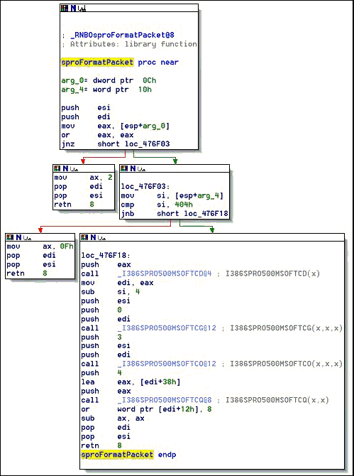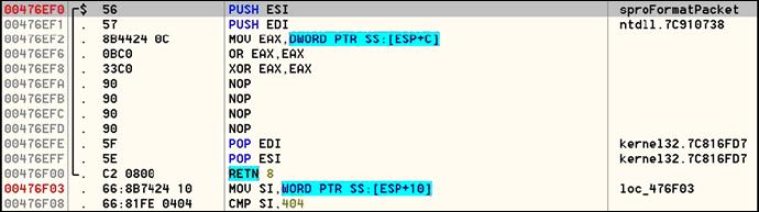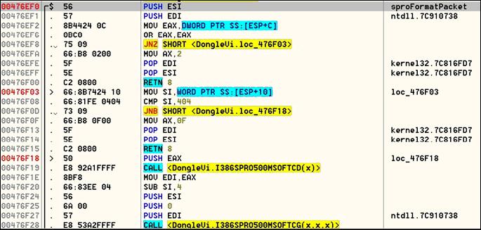 在IDA里的原始sproFormatPacket 图 19 –在OllyDbg里的原始sproFormatPacket 补丁很简单如图20所示,它仅仅把EAX原本来自[ESP+C]返回值清零。如你所见,我在第一个跳转(0x476EF8)开始重写原始API,其目的是用来略过在Sentinel
