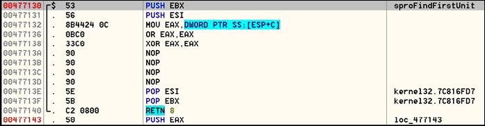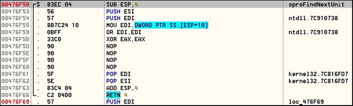 补丁的sproFindNextUnit 这个API函数和下一个sproQuery函数是我们需要模拟的两个最重要函数。之前所有的API补丁是为了让程序可以无阻碍而且无错误地结束这些API。而我们的主要破解工作是在这两个API里面做。 原始的原型是: unsigned short int sproRead( RB_SPRO_APIPACKET packet, unsigned