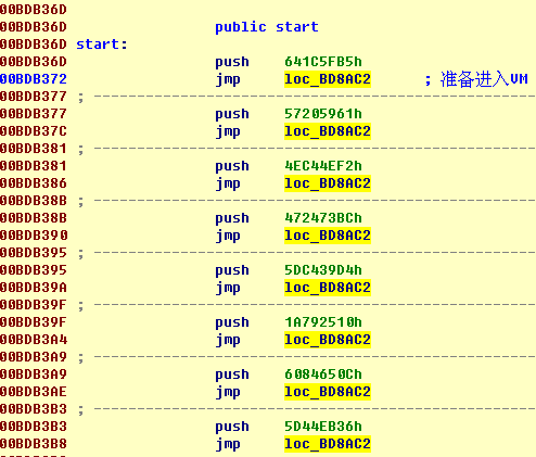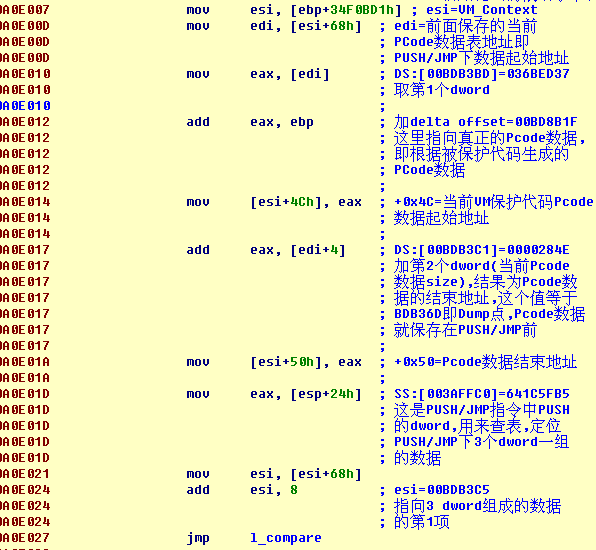 这部分代码是stolen codes专有的,每处用VM保护的代码都有自己的1份。在VM_Context内保存了2个值, PCODE数据表地址和这块代码内包含的PUSH/JMP指令对数。ret到公用的context保存代码。