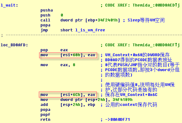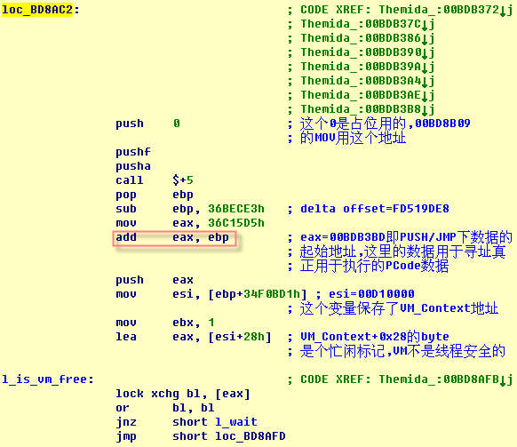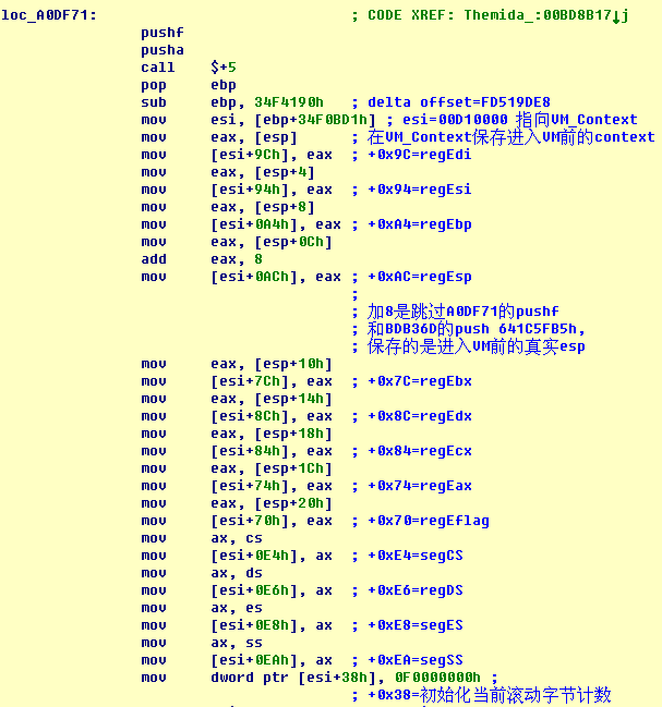首先,为什么会有多个PUSH/JMP? VM对代码的保护是“平面”的,如果被保护代码中包含有call,Themida不会将被调用函数的代码也纳入VM保护。执行到该处时,控制退出VM。执行完返回时,需要用PUSH/JMP重新进入VM。stolen codes对应的代码出现了8个PUSH/JMP指令对,意味着这段代码内存在7个call(第8次进入VM后,退出VM时控制返回到OEP处stolens codes结束后的代码地址)。