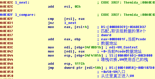 为了提高执行效率,Themida在每个handler内包含了分发代码, 从pcode数据内解码出下一条指令的opcode,查表得到对应的handler地址,以jmp esi跳过去继续执行。这样可避免用一个巨大的switch-case语句来判断opcode值。这种技巧称为Threaded Interpretation。