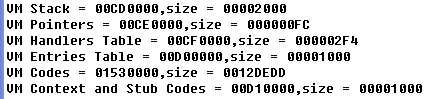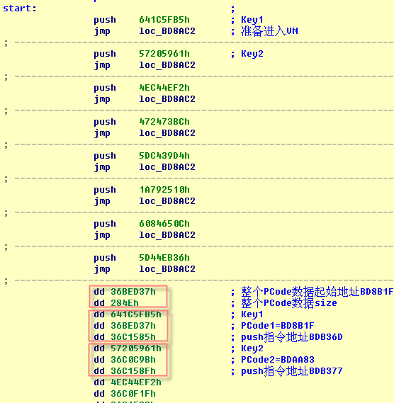 相应的,每次进入VM,需要指定对应的PCode数据(可以看作PCode的指令指针),即整个stolen codes对应的PCode数据也被分成8部分。PUSH/JMP中PUSH的值实际是个key,用来在下面的数据表中搜索对应的PCode地址。